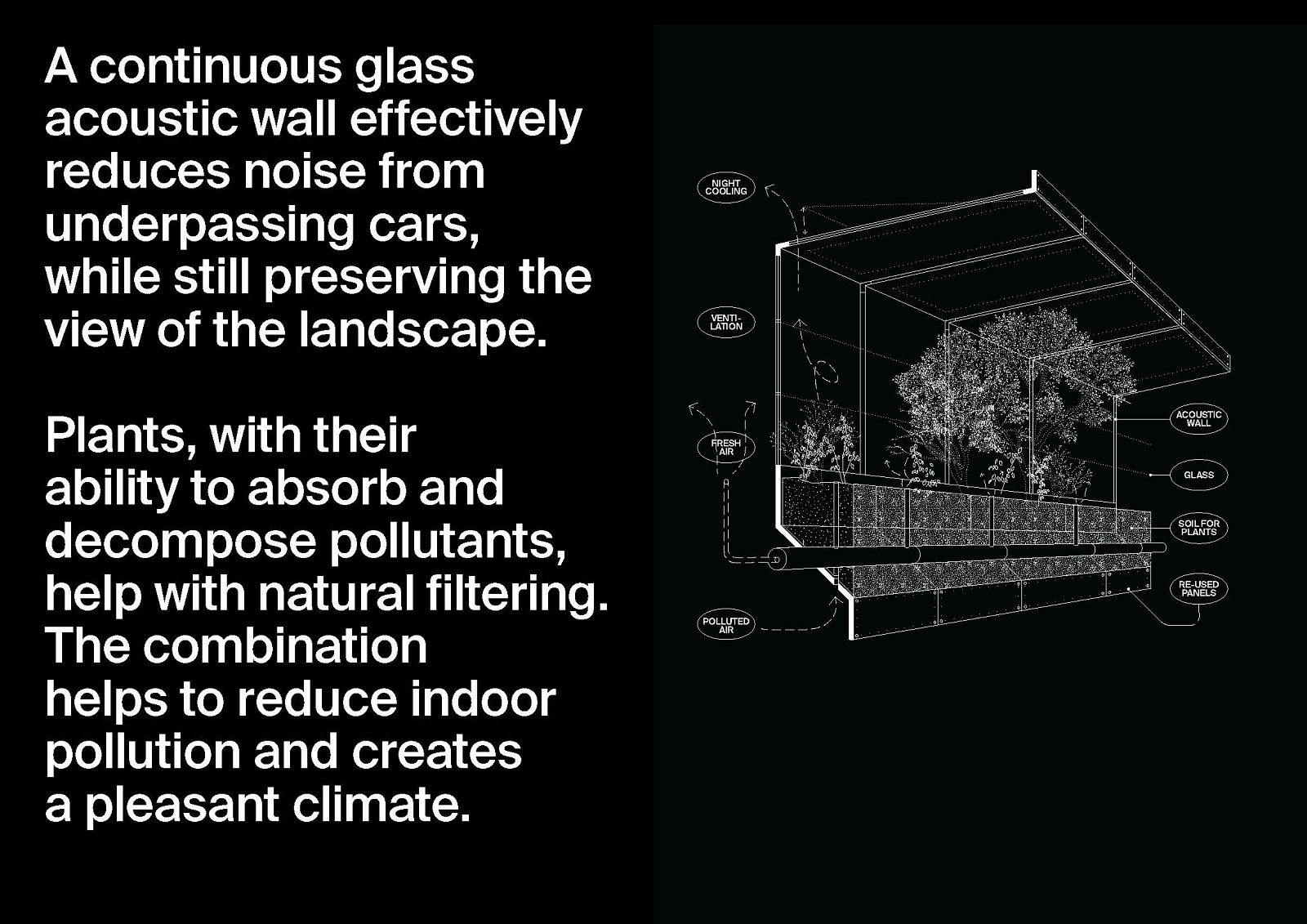 Densified building and living in noisy locations must be facilitated by adjustments regarding noise pollution in environmental protection laws and supplemented by architectural measures. Despite its unusual location next to a highway, the Balken features a glass acoustic wall to reduce noise, preserving the views. The integration of plants helps absorb and decompose pollutants, contributing to a pleasant indoor environment.