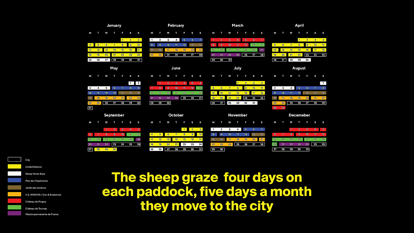 Grass, fences, water, trees – everything the flock needs can be found on site. The only missing elements, were a barn and salt for the sheep to winter. The flock is kept on rotating pastures, called padocks. There it grazes for four days before moving on, rotating from land to land, using normal asphalt roads. In the course of one year, the flock visits the United Nations, the U.S. Mission, the Rothschild estate, and many others. Every last weekend of the month, the flock leaves the Jardin des Nations and moves into the city. This urban event reconnects the isolated Jardin des Nations with the city of Geneva which is itself a city of (dis)connected madows.