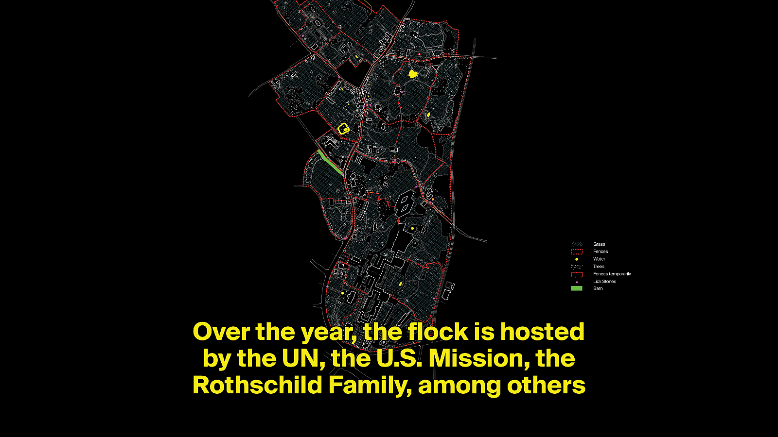 The World And The Flock speculates about the capacities of the famous Geneva sheep flock to change our perception of the city. Thus, the flock that roams the gardens of Jardin des Nations, the heart of so called International Geneva, becomes a connecting and form-making element. The project offers an alternative reading, beyond the dispersed, isolated and fenced estates of International Geneva. A narrative, that brings together three strangely interwoven Genevan stories: Mary Shelley’s Frankenstein, the NSA conspiracy theory, the Family de Rothschild history. By doing so, the circulating flock becomes a spatial factor that is ordering social realtions through the (un)built. Seen, observed, monitored, the event unfolds its impact on multiple channels: from the physical to the digital. Thereby, the public space which nowadays is weakly articulated, scattered and isolated within the city of Geneva, becomes more connected and attractive to both locals and tourists and not only for members of International Geneva.