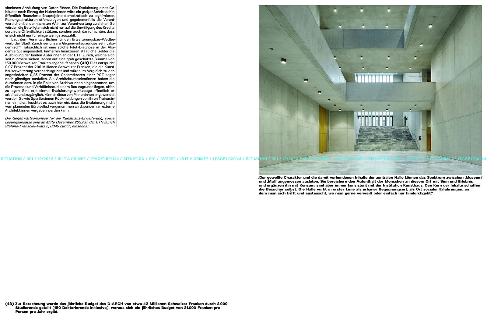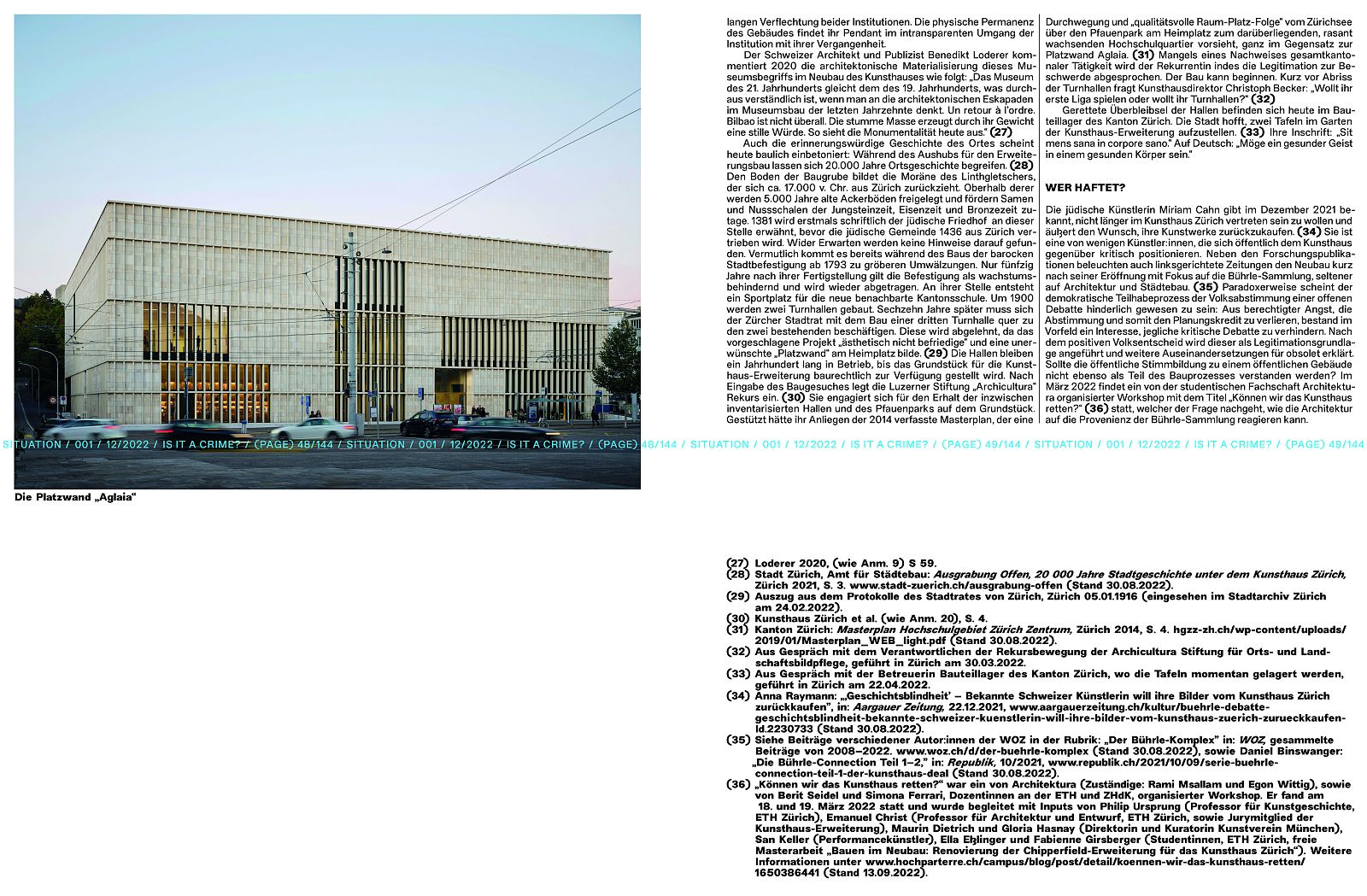 In October 2021, the fourth extension of the Kunsthaus Zürich opens on Zurich's Heimplatz. At this time, preceded by twenty years of planning, the building is falling out of time: a luxurious concrete repository for private collections with no connection to its immediate surroundings, sealing the entire site and disallowing any participation from the public, neither in its appearance nor in its programming. The repetitive limestone curtain that envelops the building reinforces the monumental character of its size, a costly expression of existing power relations. The physical inertia finds its counterpart in the institution's lack of transparency in handling its controversies. (see "Kontamination")